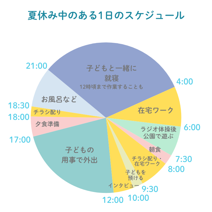 午後は子どもの用事で外出し、17時頃帰宅して夕食の支度を済ませた後、18時から30分ほどチラシを配りました。パソコン作業が立て込んでいる時には夜12時頃まで作業することもありますが、普段は夜9時頃には子どもと一緒に寝ています。