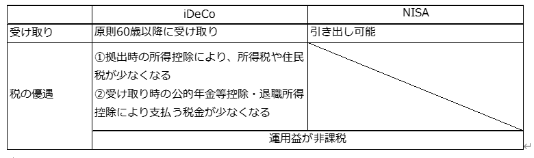 iDeCoは税の優遇面で優れていますが、原則60歳まで引き出すことができないという特徴があります。引き出せないので強制的に貯めることができるのがメリットですが、自由に引き出せる流動性を持たせたい方はNISAをメインにすると良いです。