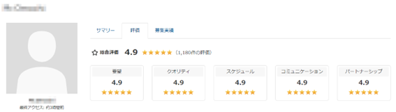 ちなみに、「クラウドワークス」の場合、ワーカーのプロフィールページには下記の画像のように評価の数や内容が表示されます。クライアントは仕事を発注する際にワーカーのこの評価を参考にしますので、できるだけ良い評価を積み上げていくと案件獲得に有利になります。