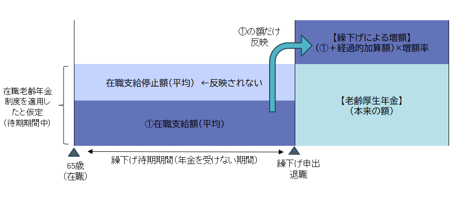 「働いている間は老齢厚生年金をもらわず、繰下げ受給にすればいいのでは?」と思う方もいらっしゃると思いますが、残念ながらそれは意味がありません。繰下げ受給を選ぶと、年金額が繰下げた月数×0.7%分増額されるのですが、増額される年金額から、在職老齢年金で停止されたであろう額の分は差し引かれて計算されてしまうためです。
