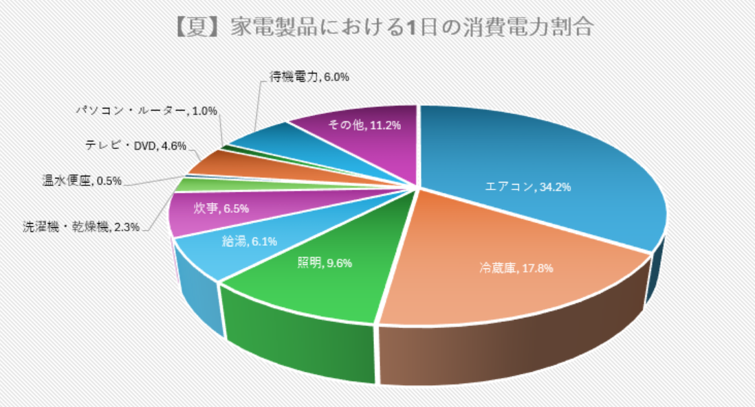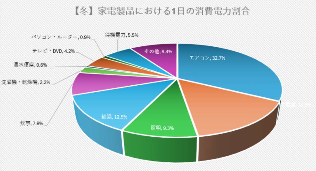 夏と冬では家電ごとの消費電力が異なります。電気の使い方を意識してみると、ガマンせずに家電を使いつつも節電につながりやすくなります。