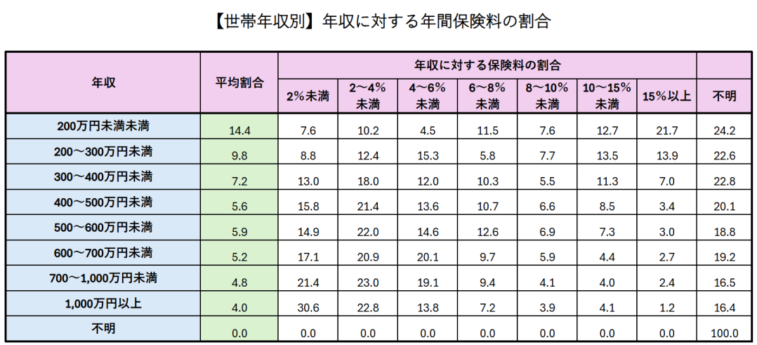 生命保険文化センター「2024(令和6)年度 生命保険に関する全国実態調査」によると、年収に対する保険料の割合は以下のとおりです。