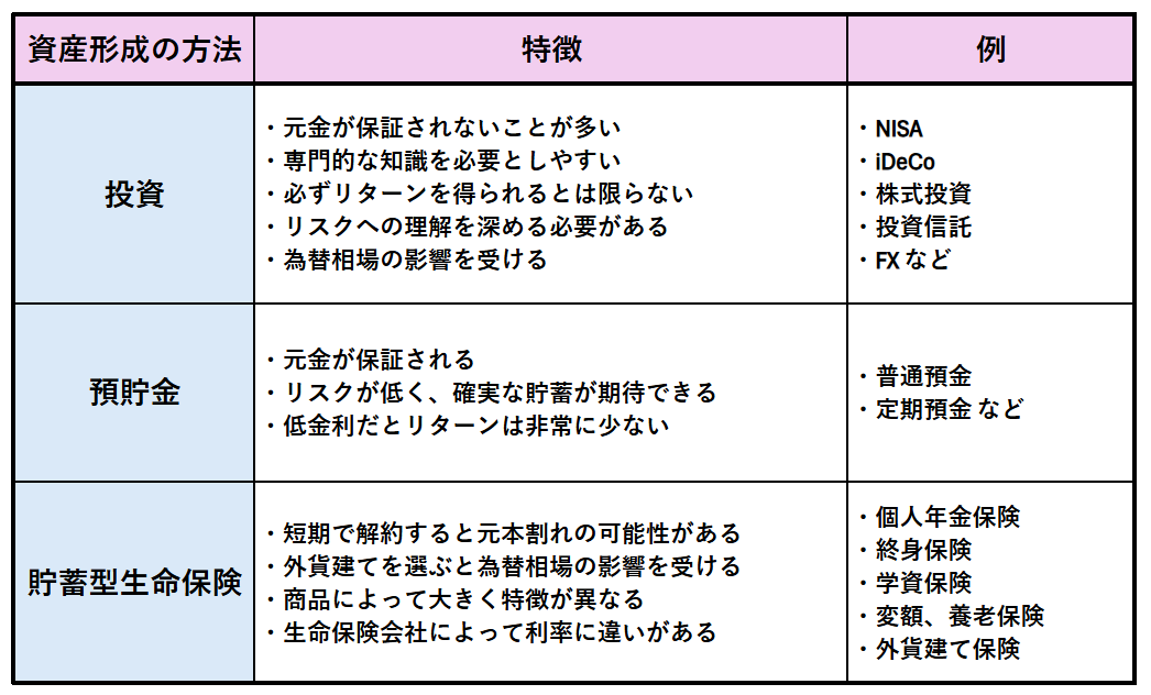 資産形成の方法は複数あります。しかし、資産形成の方法は家計にあう種類を選ぶことが大切です。資産形成の方法とそれぞれの特徴は以下のとおりです。