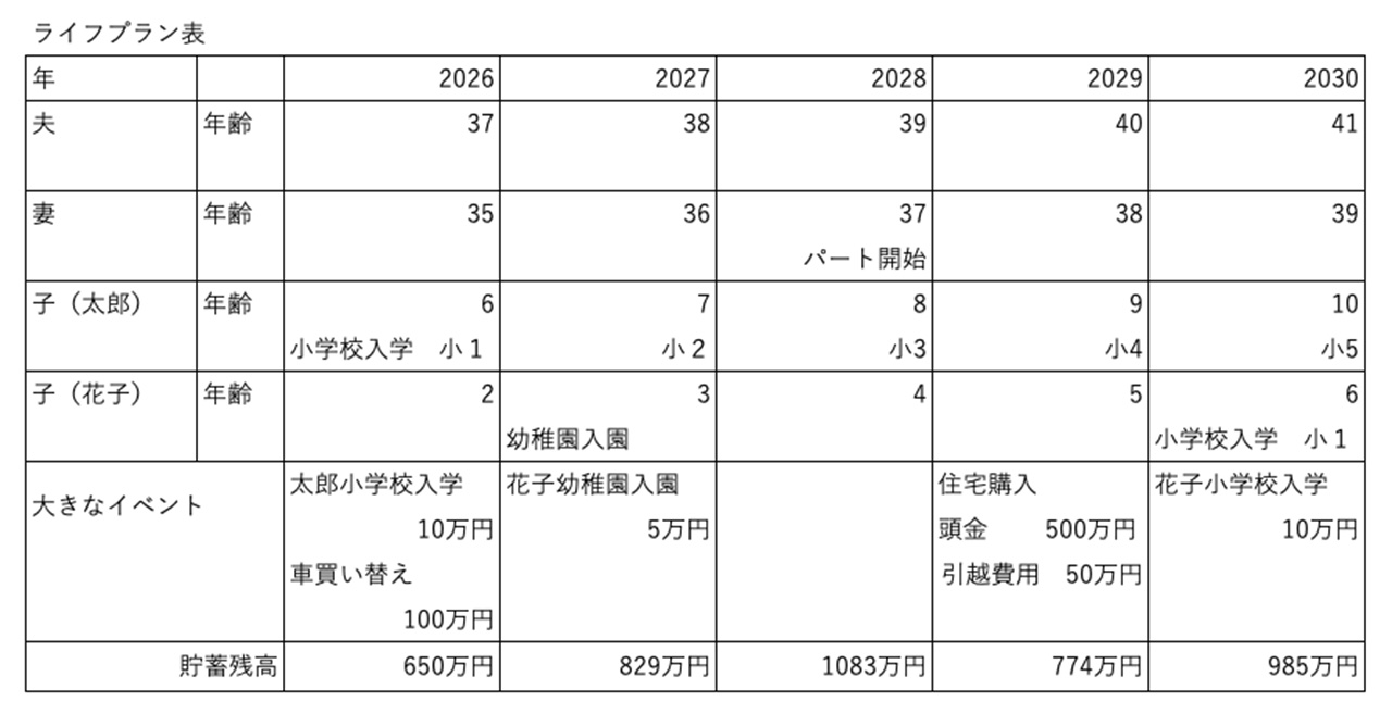 夫婦と子ども2人の家族の5年後までの予定をライフプランノートに書き込んだ例を作成しました。サンプルのため簡素化していますが、実際に作る場合は、内容や期間を自分にあった具体的なものに変更します。5年間ずつ把握したい、中長期で10年後や30年後まで書き込みたいといった自分の理想にあわせて、自由に設計するといいでしょう。