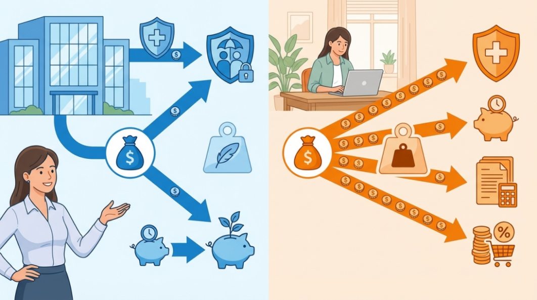フリーランスになると手取りが減る主な要因は、会社員時代に会社が負担していた部分を自分で支払う必要があるからです。会社員の場合、健康保険料や厚生年金保険料は会社と折半ですが、フリーランスになると、国民健康保険と国民年金を全額自己負担することになります。