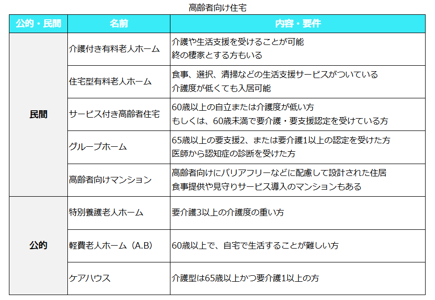 老後の賃貸物件探しでは、一般的な賃貸物件に加えて、「高齢者専用賃貸住宅」など高齢者向けの物件を選択肢に入れるのもおすすめです。高齢者向けの賃貸住宅や施設には様々な種類があり、内容や入居資格が異なります。自分に合った住まいを選ぶことで老後の暮らしが快適になります。