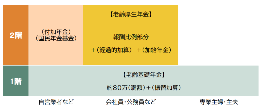 まず、年金には大きく分けて「老齢基礎年金」と「老齢厚生年金」の2種類があり、よく2階建て年金と呼ばれています。そのうち、すべての人が対象となる1階部分が「老齢基礎年金」です。