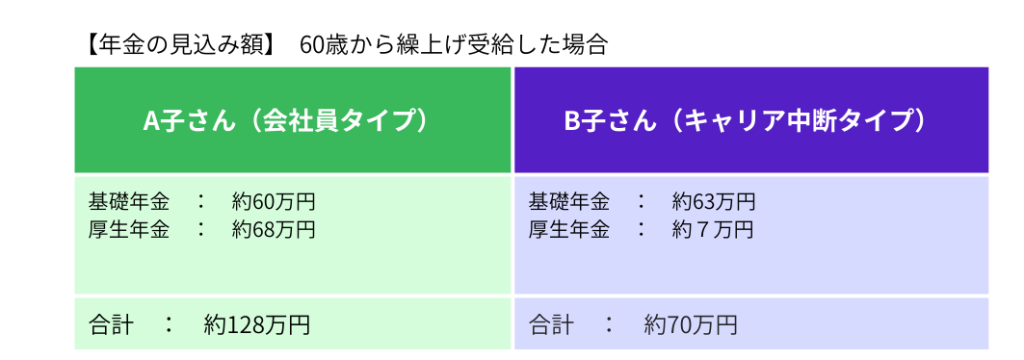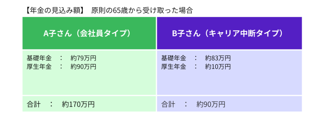 老齢厚生年金は、ずっと納付を続けているA子さんと、キャリアの中断があり、パート復帰後も厚生年金に加入していないB子さんでは大きな違いが出ています。
