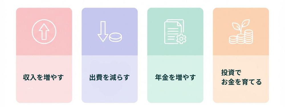 「収入を増やす」「出費を減らす」「年金を増やす」「投資でお金を育てる」