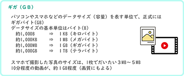 約1,000メガ(MB)が1ギガ(GB)ですが、目安としては、スマホで撮影した写真1枚が3~5メガです。
