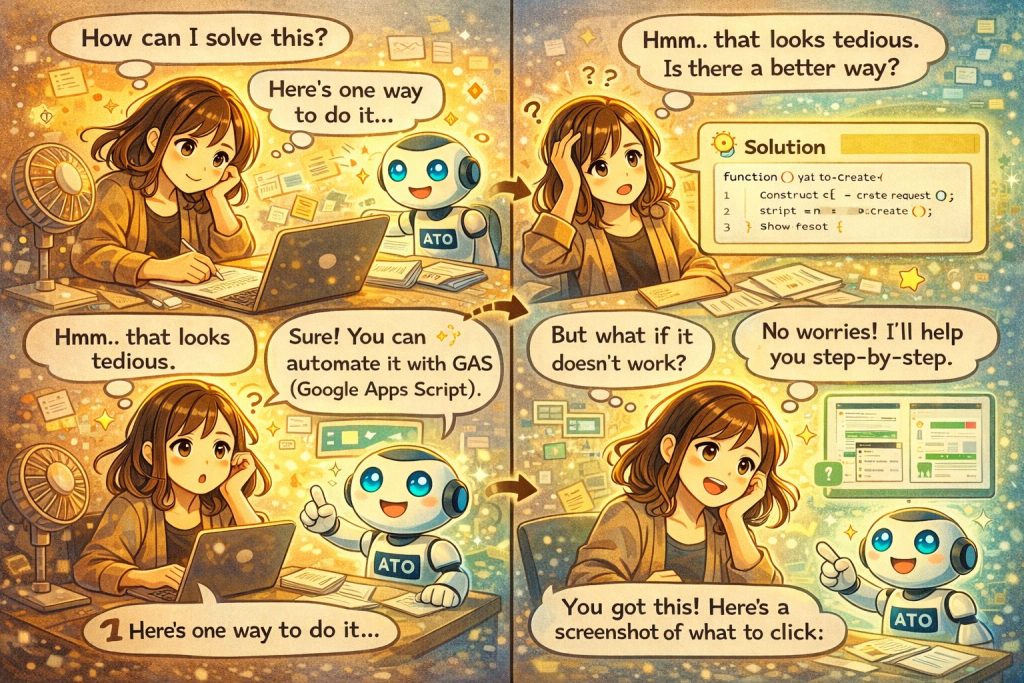「自分でやったほうが早い」って思う気持ち、わかります。でも、一度AIさんに聞いてみると、意外とあっという間に解決することも多いんです。うまくいかなかったらどうしよう、という不安も、AIさんが一緒に解決してくれる。積み積みで、「これもAIに聞いてみよう」が増えていくといいなと思います。